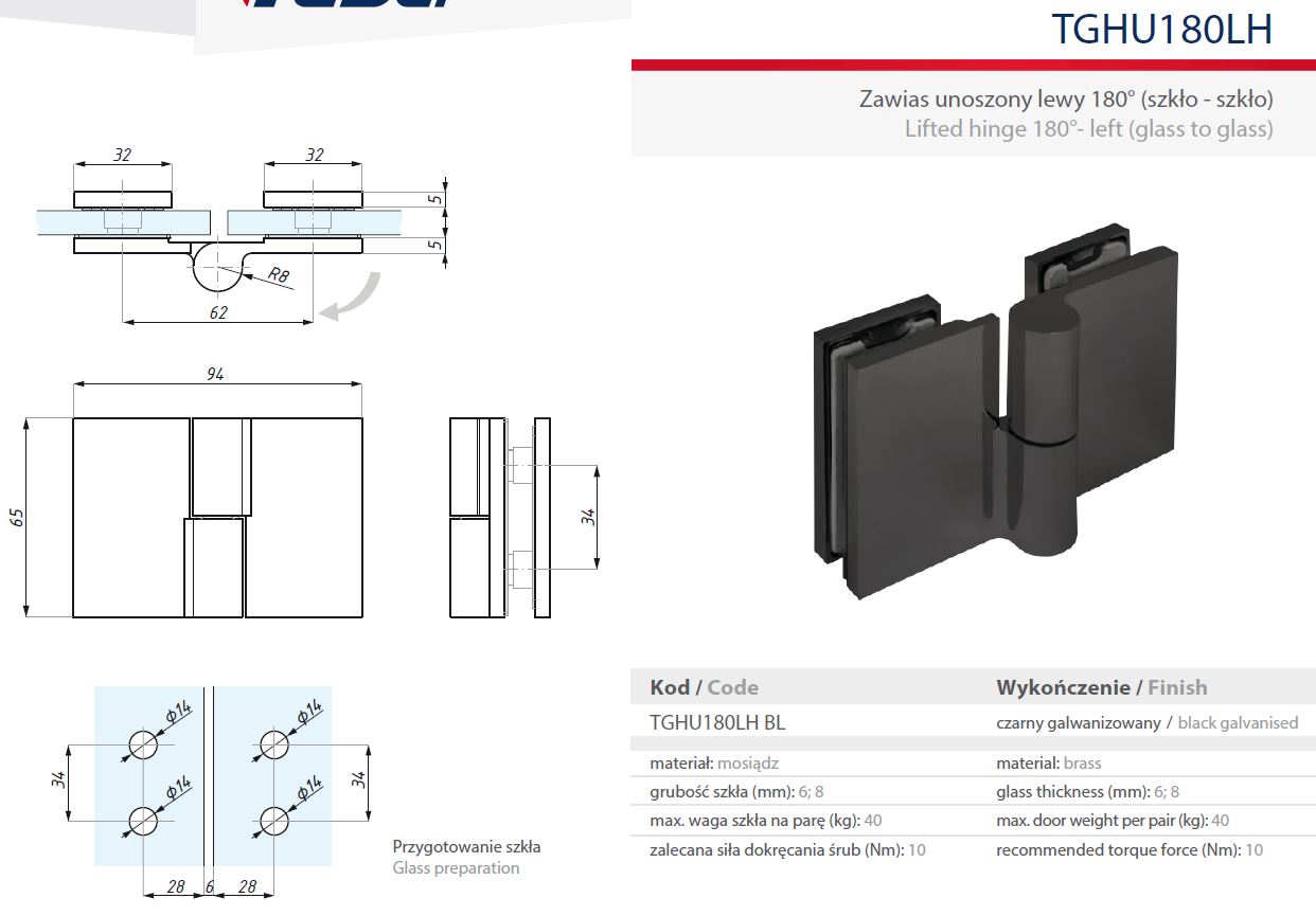 CDA hinge Lifted hinge 180˚ - left (glass to glass) black