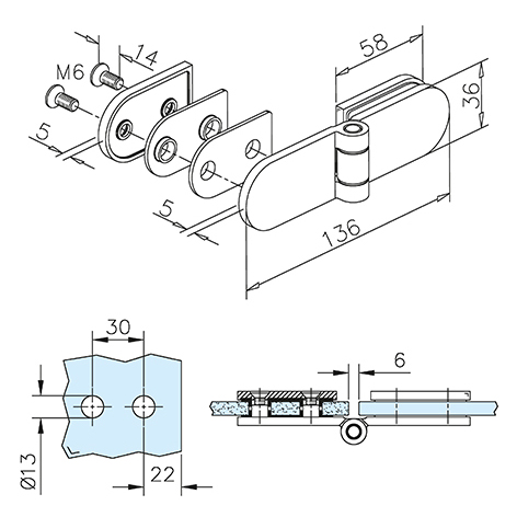 GF Glass door hinge, glass/glass, for 6-10mm glass, sss