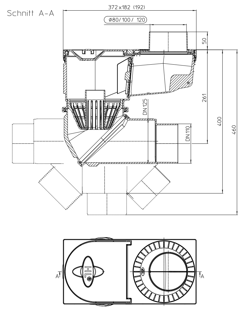HL Rain hopper DN110/125 with ball joint, leaf catcher, frost-proof stench-flap, inspection lid and pipe fittings - HL600N