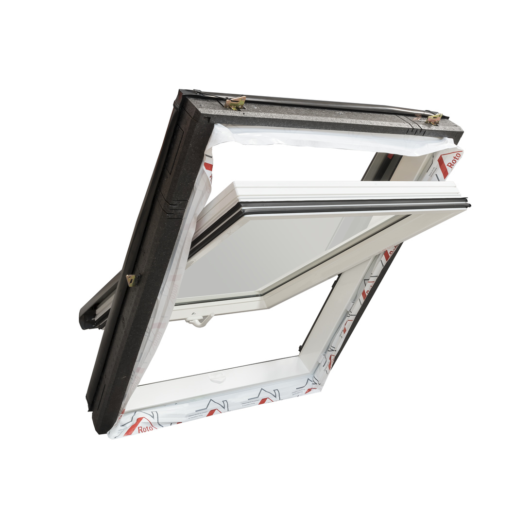 Roto Designo R4 K WD on traditsiooniline, keskel asuva avanemisteljega, PVC plastprofiilist katuseaken, mille käepide asub akna alaosas.