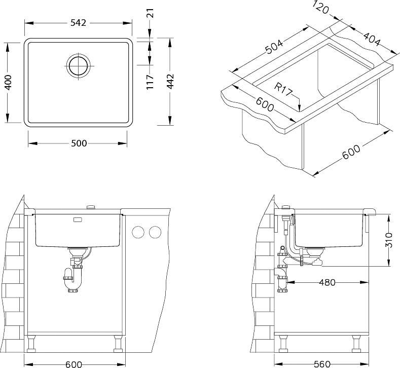 ALVEUS köögivalamu KOMBINO 50, 542x442mm, pealt paigaldatav (F/S), roostevaba teras, satiin
