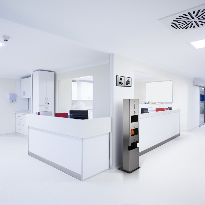Kolm ühes multifunktsionaalne desinfitseerimisjaam ühendab automaatse puutevaba desinfitseerija, ühekordsete kummikinnaste hoidiku ja prügikasti kinnaste või maskide jaoks. Kõik see võimaldab keskenduda ühele seadmele,