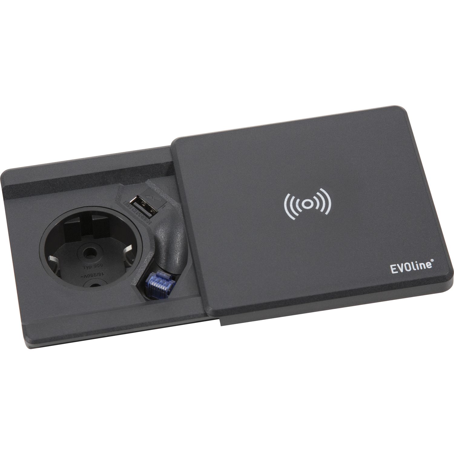 SCH EVOline Square 80 pistikupesa, 1xSchuko+USB laadija+QI RJ45 data kaabel+QI laadija, must