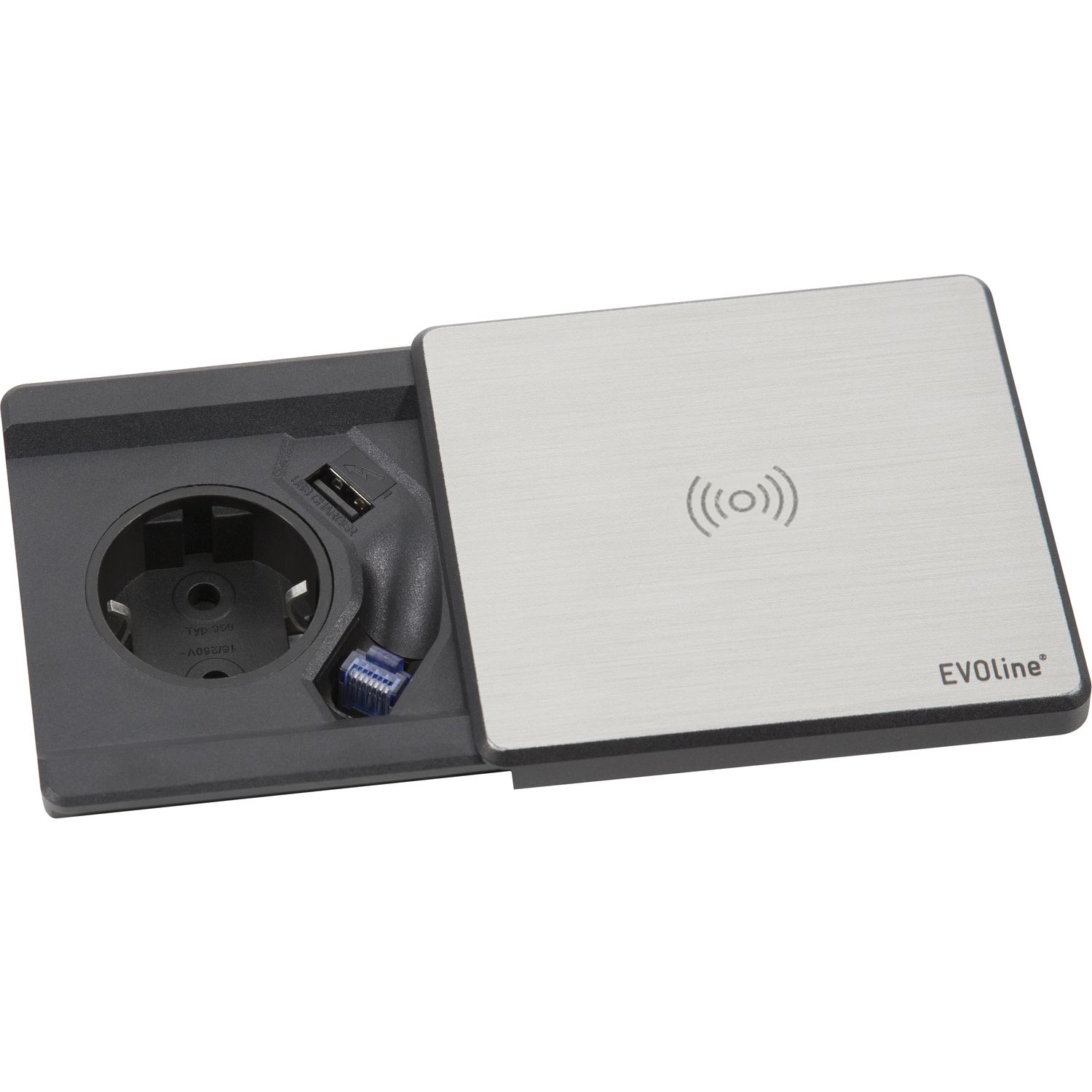 SCH EVOline Square 80 pistikupesa, 1xSchuko+USB laadija+QI RJ45 data kaabel+QI laadija, roostevaba